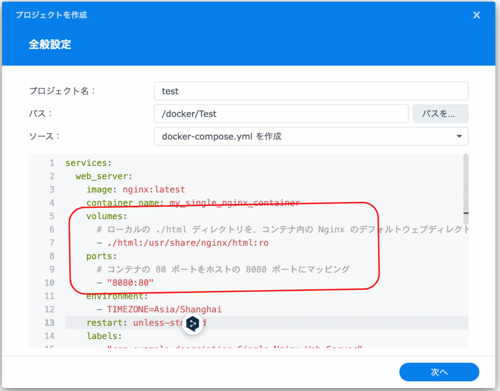 特別な注意点として、Docker Composeを自分のNASで使用する場合は、Docker Composeファイル内のパスを変更することです。先に述べた マウントタグボリュームと 変数ファイルenv_file タグは、どちらもパスの設定に関係しています。ほとんどのNASシステムでは、Docker Composeを追加する際にパスを設定する必要があり、このパスがコンテナプロジェクトがNAS内のファイルを保存する場所になります。